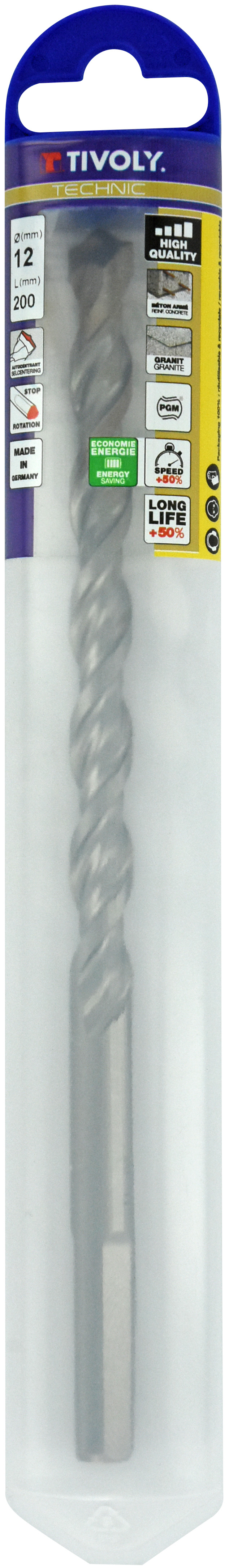 Foret bétons L200mm -Plaquette carbure pointe de centrage -Queue cylindrique 3 méplats / L: 200 Ø: 12 TIVOLY - 10913121200