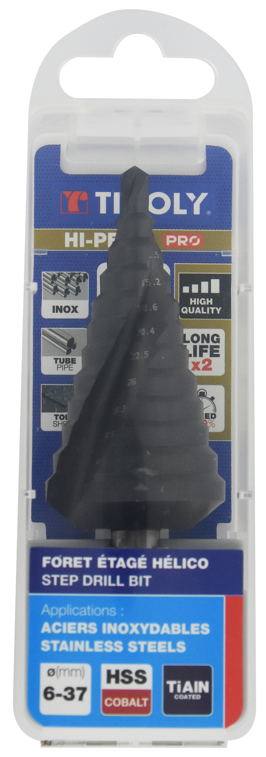 Foret conique étagé HSS-E5 -Revêtu TiAlN -TivolyNorm -Hélicoïdal -Pointe en croix -Queue à 3 méplats / ØMin/Max : 6/37 TIVOLY - 11448720637