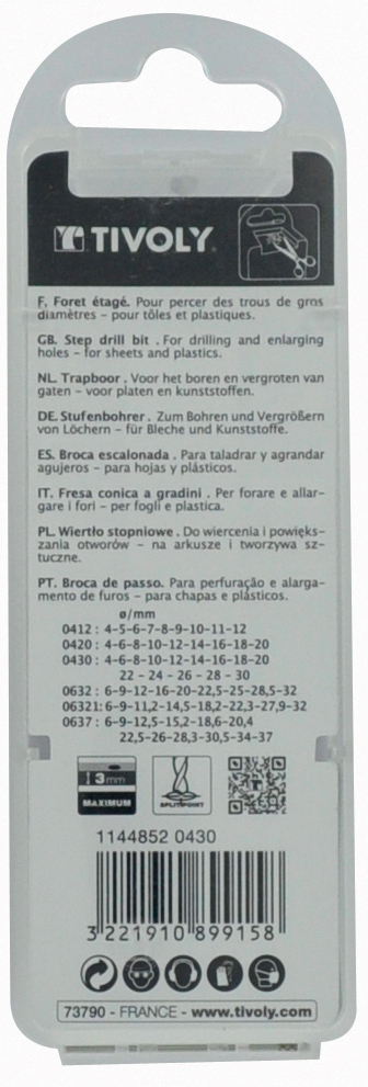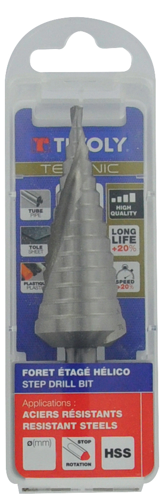 Foret conique étagé HSS -TivolyNorm -Hélicoïdal -Pointe en croix -Queue à 3 méplats / ØMin/Max : 4/30 TIVOLY - 11448520430