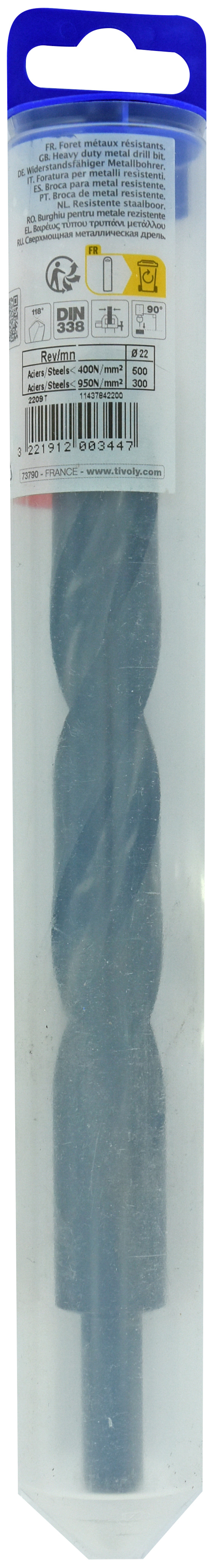 Foret métaux T taillé meulé HSS -DIN338 -h8 -Pointe en croix -Queue réduite Ø: 22 L: 210 TIVOLY - 11437842200