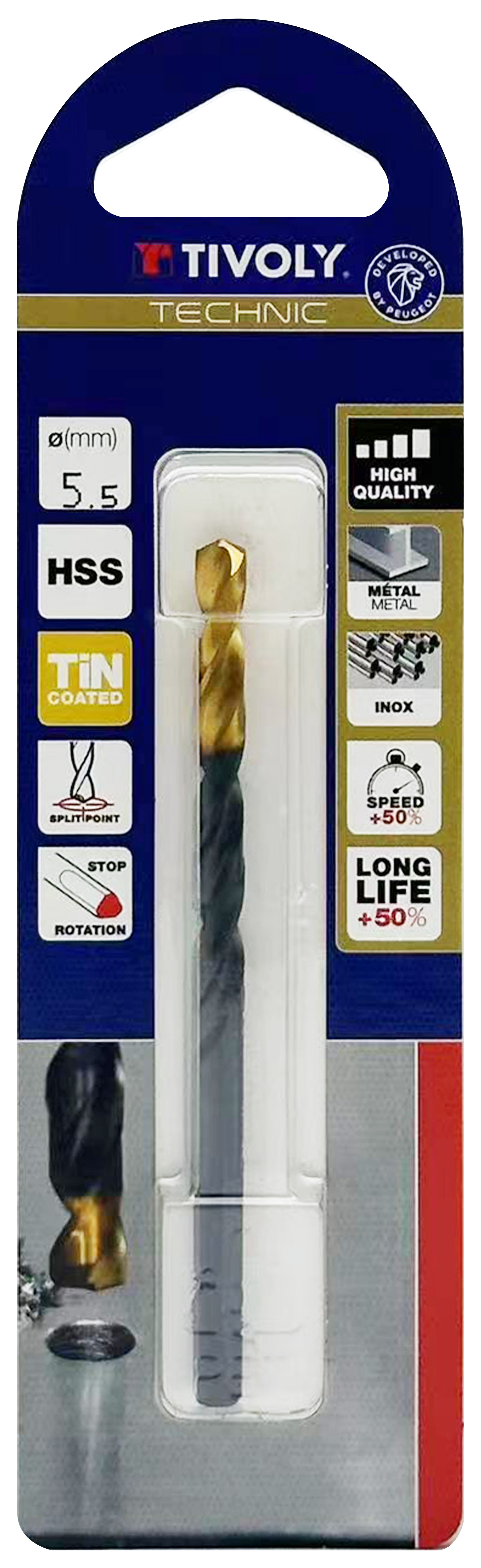 Foret métaux taillé meulé HSS -Revêtu en bout TiN -DIN338 -h8 -Pointe en croix -Queue à 3 méplats Ø: 5.5 L: 93 TIVOLY - 11453120550
