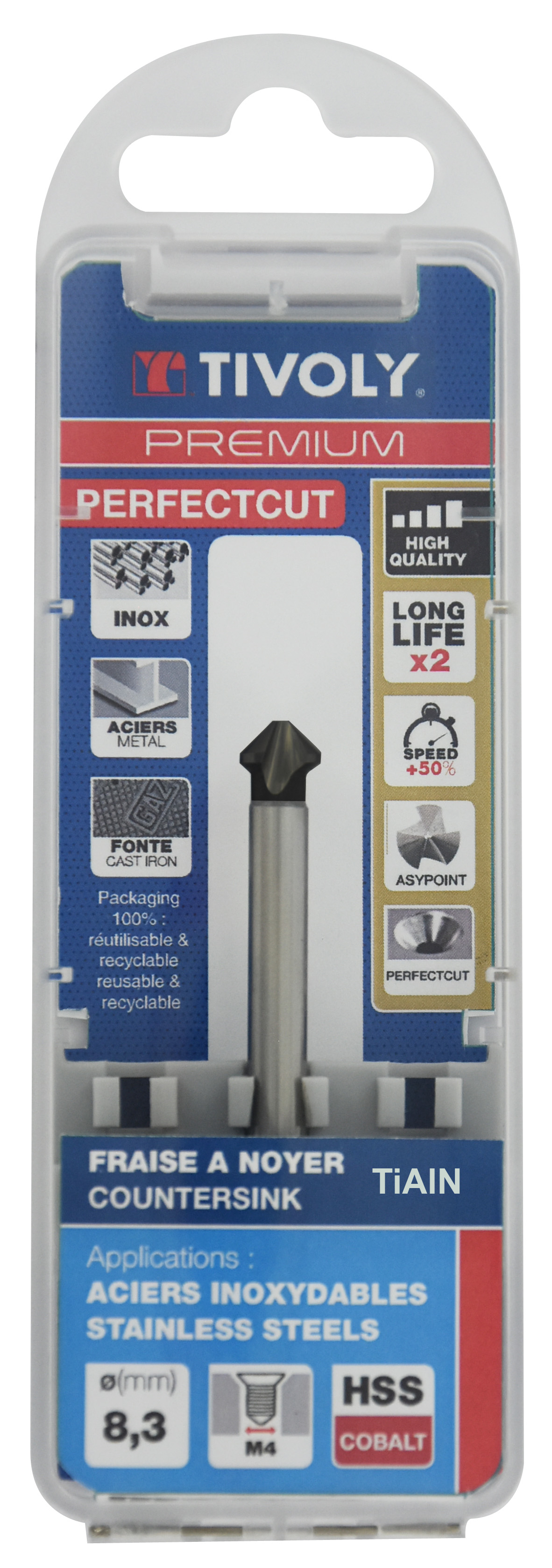 Découvrez Fraise à noyer PERFECTCUT 90° HSS-E5 Revêtues TiAlN -DIN 335C - Affûtage ASYPOINT - Queue à 3 méplats / Ø: 8.3 / L: 50 TIVOLY - 10366310830 disponible à l'achat