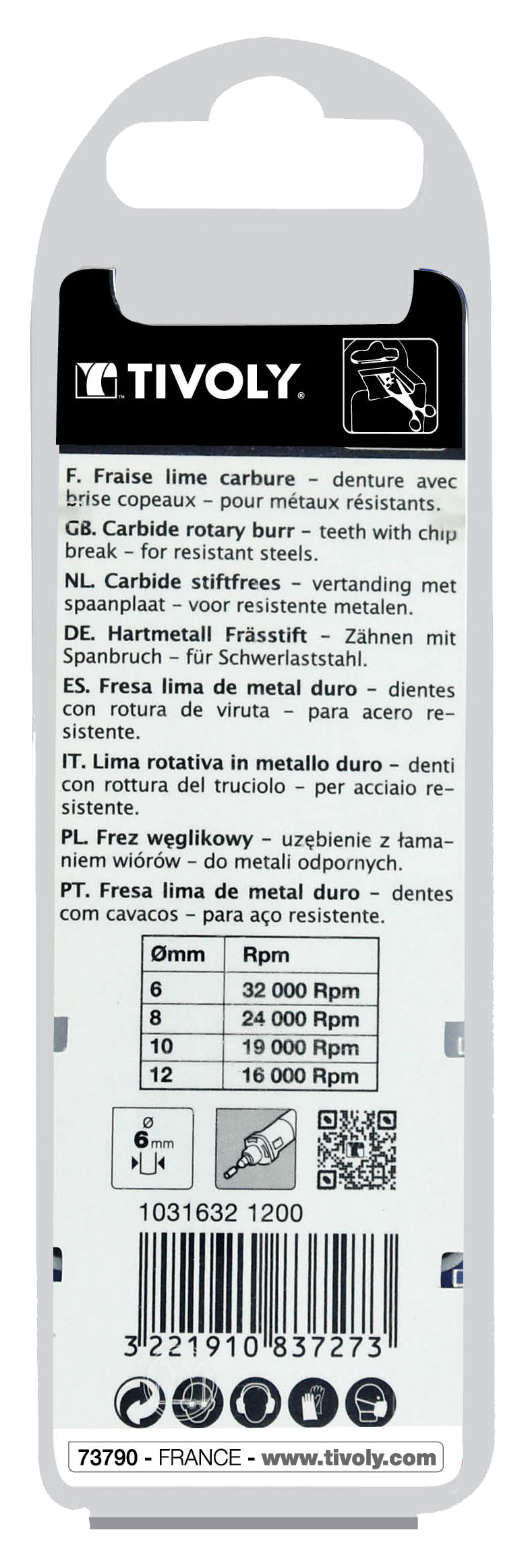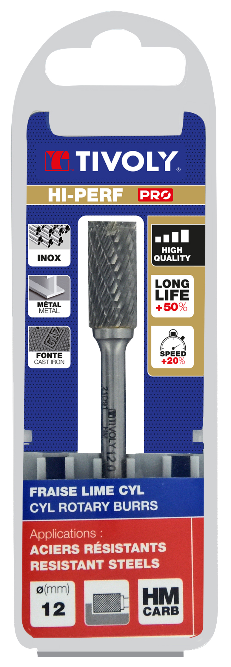 Fraise lime carbure Cylindrique en bout Denture normale brise copeaux Forme D # / Ø: 12 / d2: 6 / L: 70 TIVOLY - 10316321200