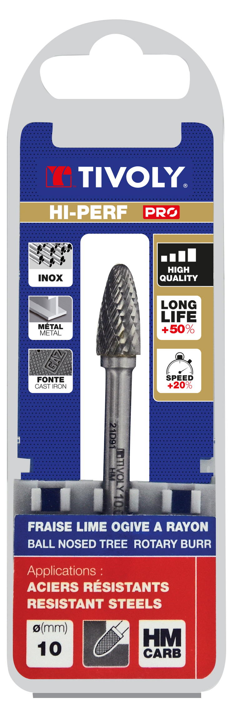 Fraise lime carbure Ogive à rayon Denture normale brise copeaux Forme D # / Ø: 10 / d2: 6 / L: 65 TIVOLY - 10318321000
