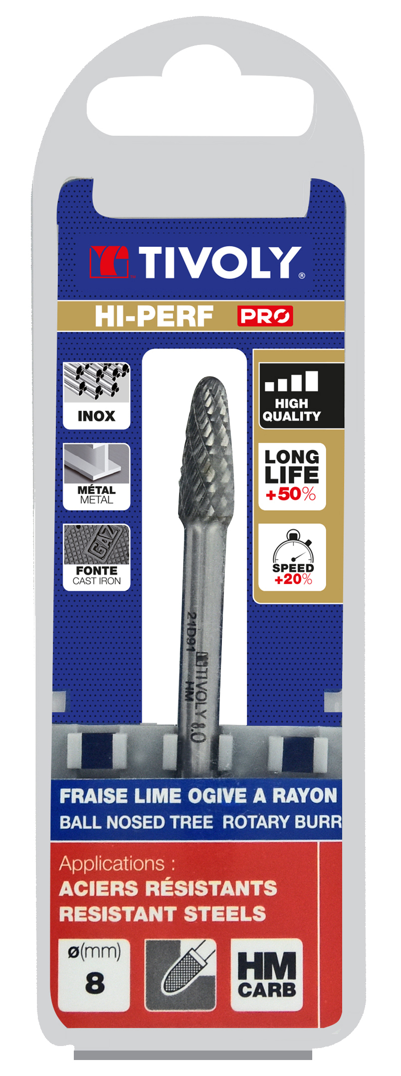 Fraise lime carbure Ogive à rayon Denture normale brise copeaux Forme D # / Ø: 8 / d2: 6 / L: 63 TIVOLY - 10318320800