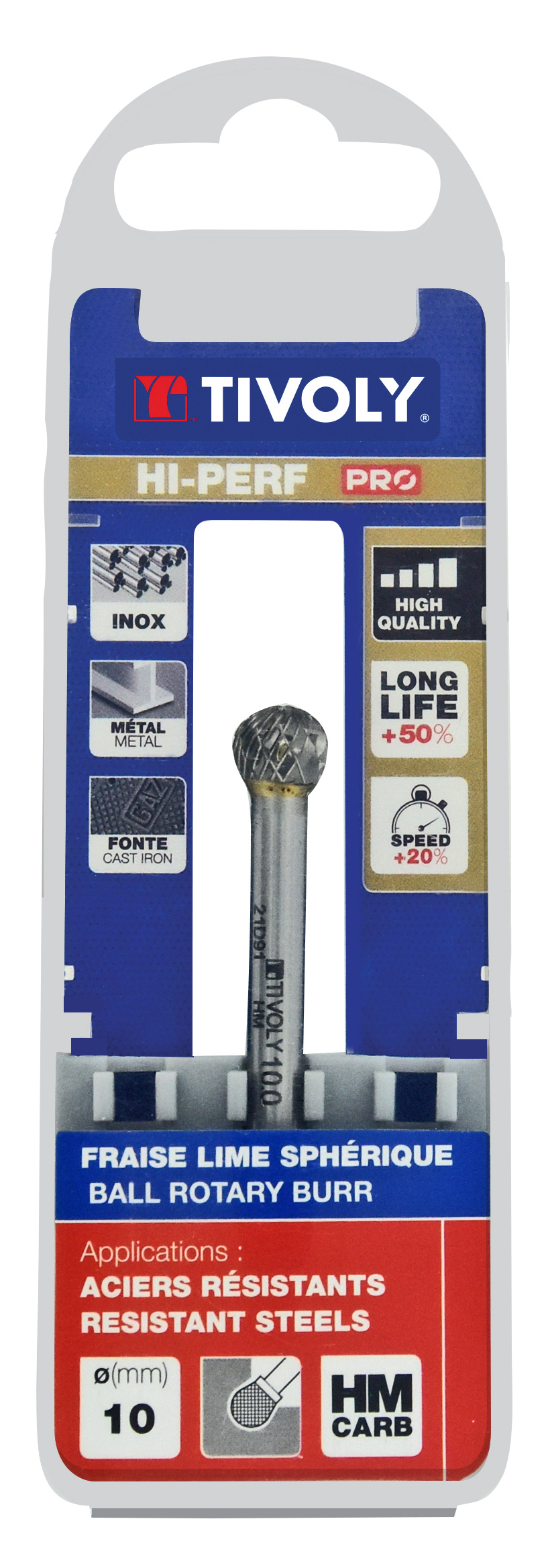 Fraise lime carbure Sphérique Denture normale brise copeaux Forme D # / Ø: 10 / d2: 6 / L: 70 TIVOLY - 10318521000