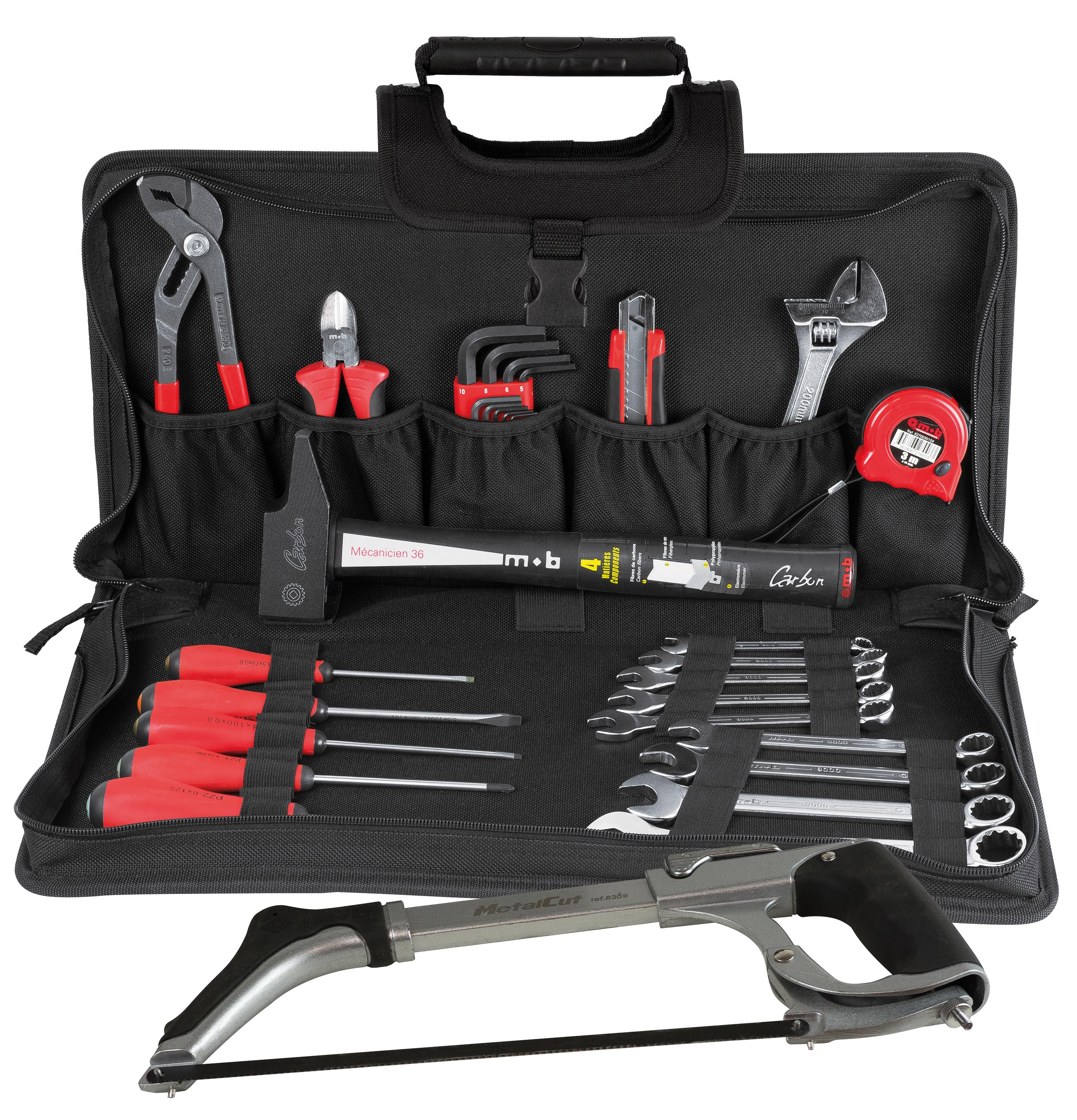 • Comprend clés, tournevis, pinces, scie et outils divers.