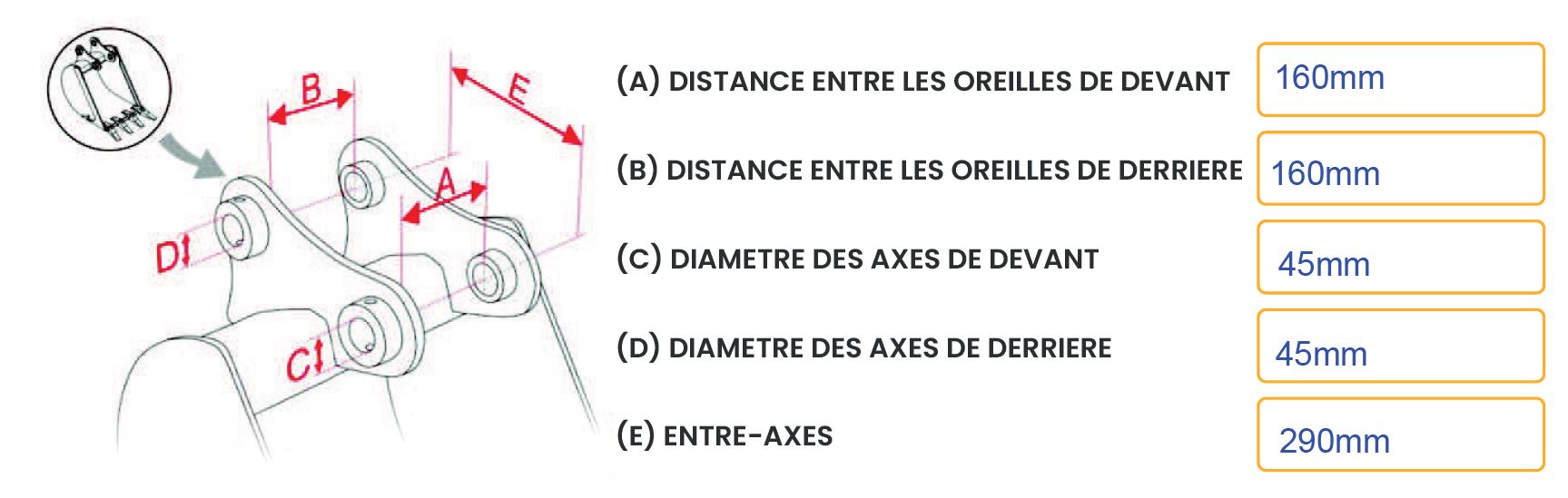 - Diamètre des axes : 45 mm (pour les axes avant et arrière)