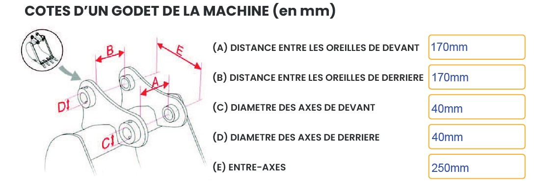 Il est recommandé de respecter les conditions d’utilisation liées au poids et à la compatibilité avec les mini et midi pelles de 1 à 2,5 tonnes. Le godet doit être stocké dans un endroit sec pour préserver ses matériaux et garantir une longévité optimale.