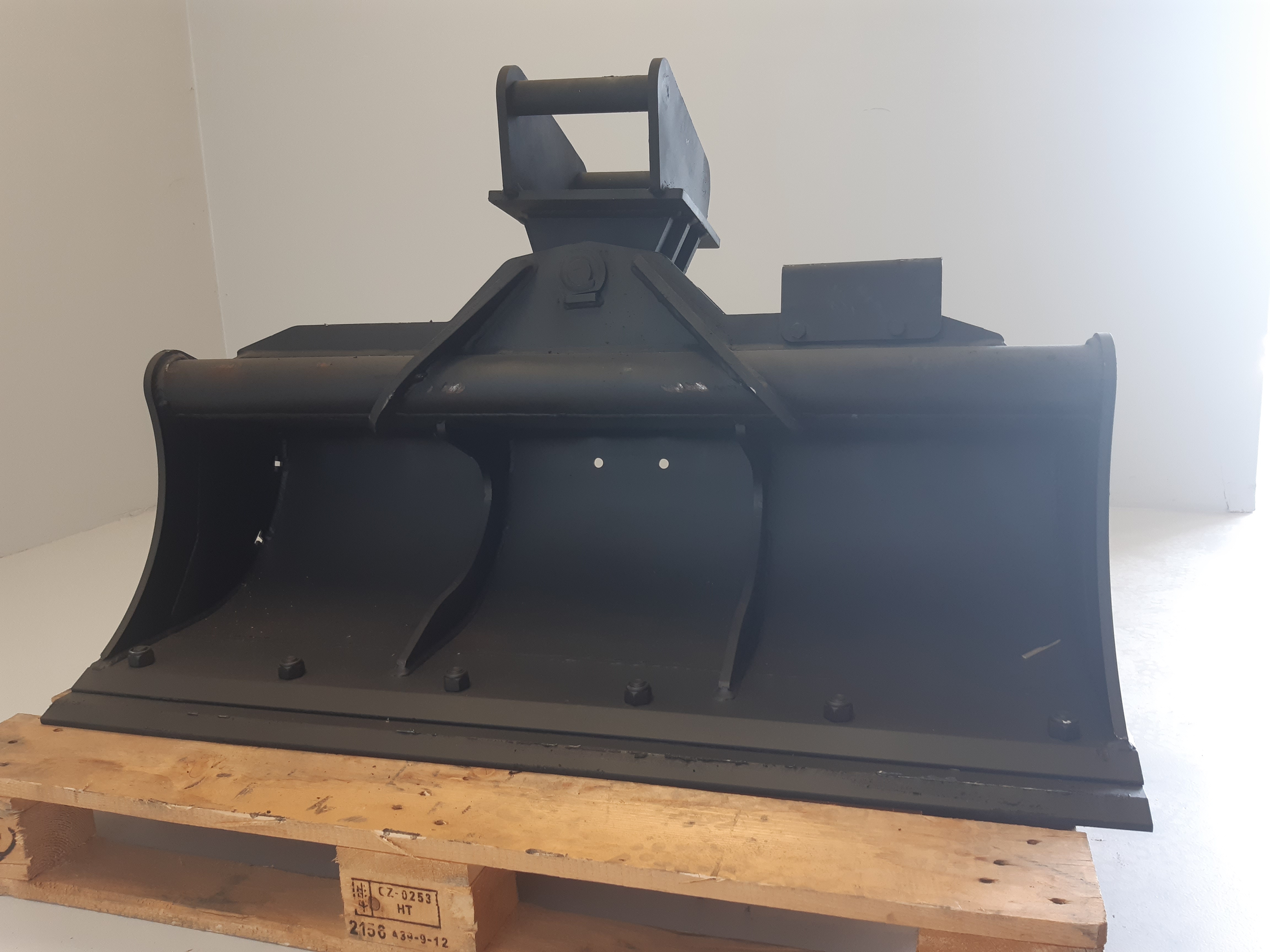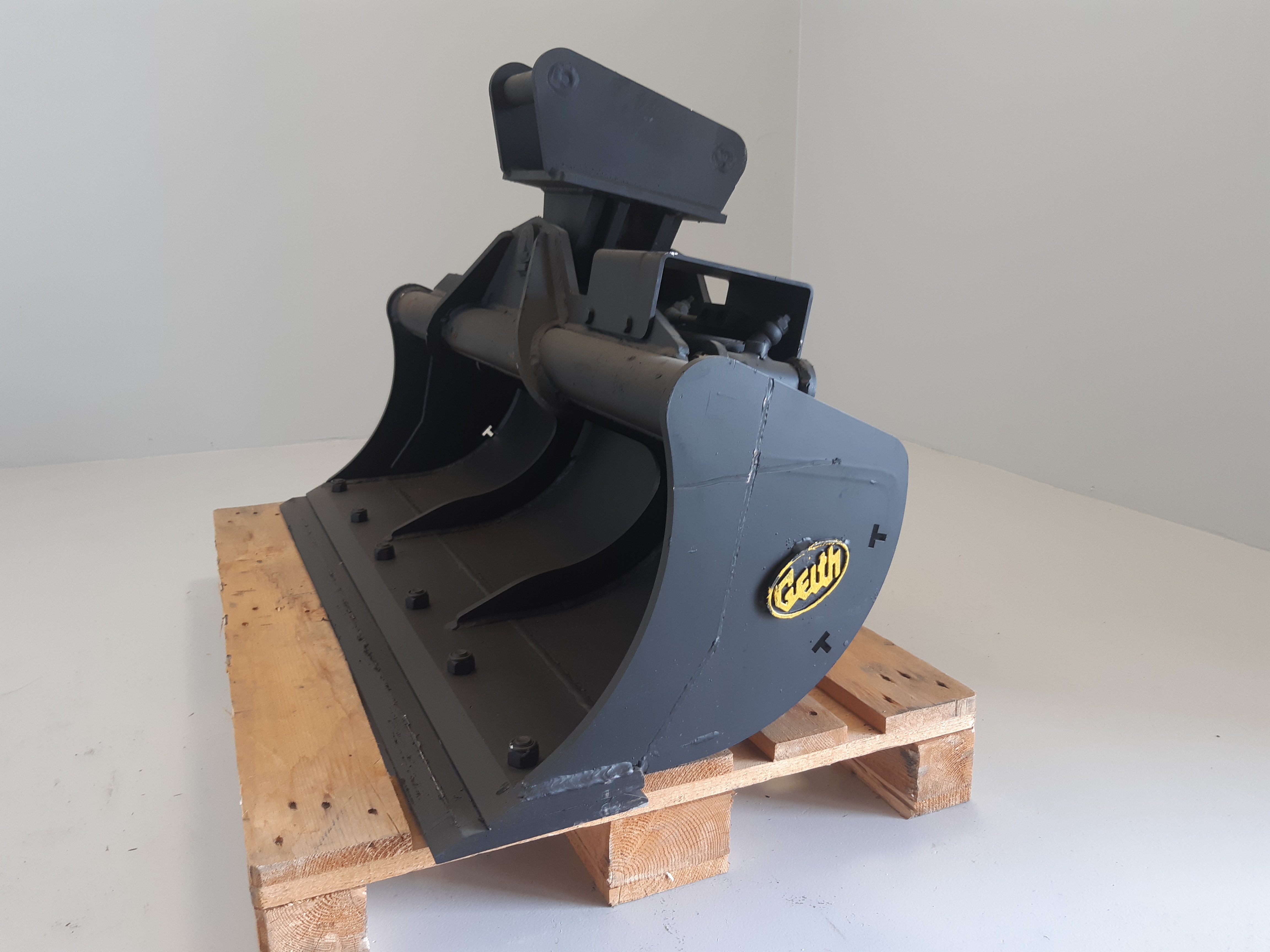 Godet adaptablé pour des machines de 2 à 29 tonnes Un dispositif pivotant optimal permet d’obtenir une inclinaison à 90° (45° dans chaque direction). Deux vérins hydrauliques robustes dotés de tiges durcies permettent d’atteindre une excellente force de rétention. Des protections contre les déversements et des protections de vérin protègent la tige du vérin et les raccords hydrauliques. Équipé de régulateurs de débit pour un réglage facile de la vitesse d’inclinaison, il s’adapte aux préférences de travail de chacun (disponible à partir des pelles de 11 tonnes)