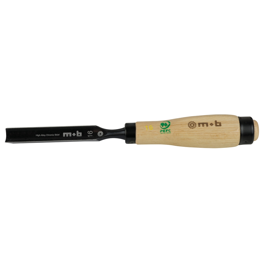 Manche bois. ERGONOMIE Essence de bois haute densité : charme (6 kg/m3). ROBUSTESSE ET MAINTIEN Précision de frappe grâce à une extrémité plate. Virole de renfort pour éviter le champignonnage et l'éclatement du bois. Méplat empêchant l'outil de rouler. La soie ne vrille pas dans le manche grâce à son assemblage à section angulaire. RÉSISTANCE - Lame forgée en acier à haute teneur en carbone et en chrome. Dureté 59-63HRC. FINITION ET MARQUAGE - Brunissage et vernis de protection. - Marquage précis des dimensions pour une identification facile. PRÉCISION - Usinage fin pour un taillant de grande rectitude agressif et durable.