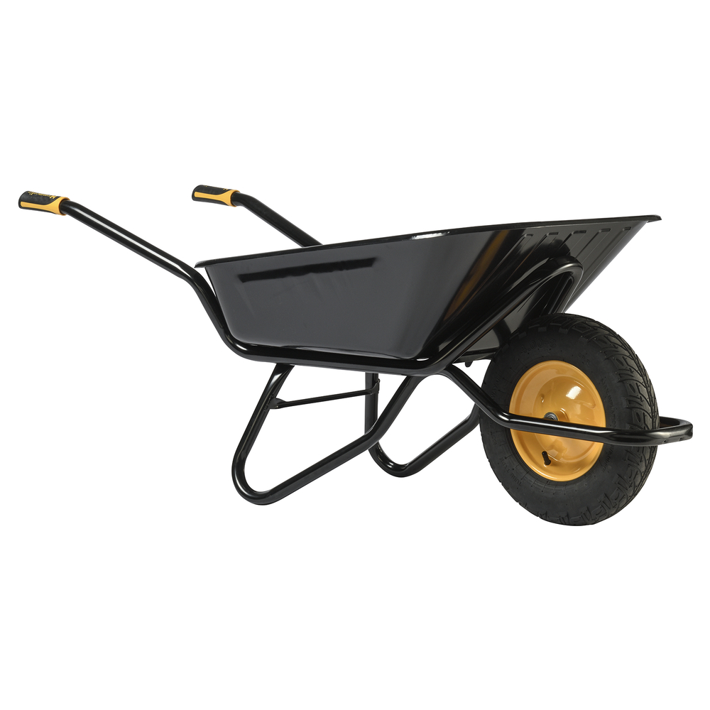 Cette brouette offre une grande contenance de 100 litres grâce à sa caisse en métal peinte d’une épaisseur de 1 mm, adaptée pour transporter des matériaux en quantité sur les chantiers.