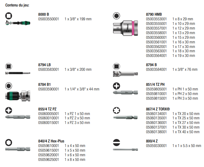 Les caractéristiques techniques incluent également une rallonge Zyklop avec bague de rotation rapide pour atteindre les zones étroites, un adaptateur Zyklop 3/8 pour plus de compatibilité avec d'autres outils, et des embouts TZ, PZ, TORX® et Hex-Plus qui apportent une véritable polyvalence à votre kit.
