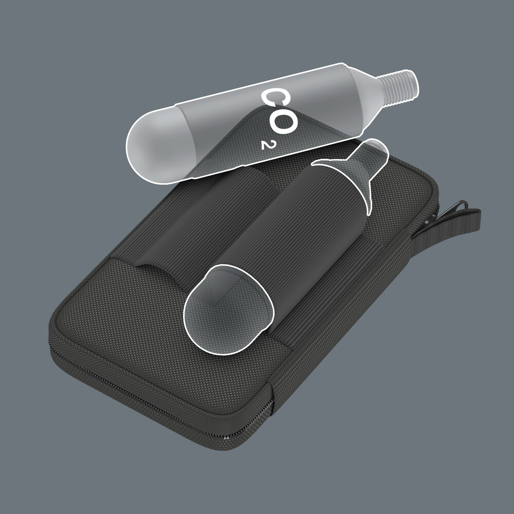 La pochette se glisse parfaitement dans la poche d'un maillot, elle est donc intéressante aussi pour les coureurs cyclistes qui n'ont pas de sacoche. À l'arrière se trouvent également deux boucles pour des cartouches de CO2.