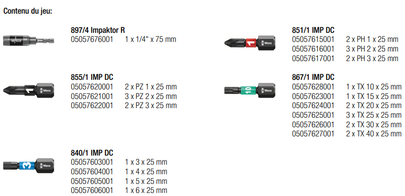 11x 867/1 Embouts TORX® IMP DC Impaktor: TX 10x25 mm, TX 15x25 mm, 2x TX 20x25 mm, 3x TX 25x25 mm, 2x TX 30x25 mm, 2x TX 40x25 mm
