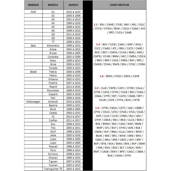 Universelle pour de nombreux véhicules du groupe VAG et plus particulièrement les motorisation 1.2 / 1.4 / 1.6 / 1.9 / 2.0 TDi Audi A3, A4, A6, Å koda Octavia 2, Fabia, Volkswagen Golf, Golf Plud, Jetta, Touran, Lupo, Fox, Bora, Beetle, Caddy, Sharan, Passat, Seat Leon, Toledo, Althea, Alhambra