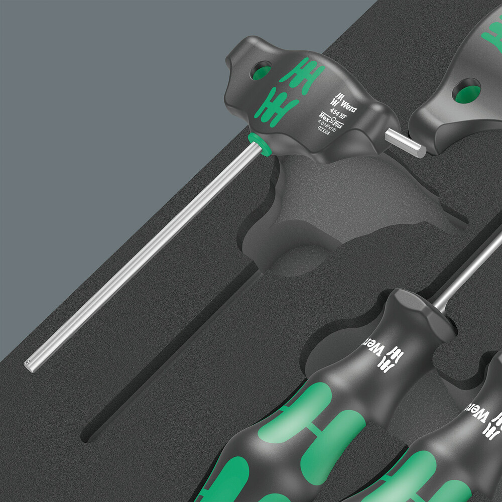 Insert en mousse durable ; bicolore pour repérer rapidement les pièces manquantes ; compatible avec la servante d'atelier Tool Rebel ; équipé de 10 tournevis Wera (atelier, Micro et manche en T) pour vis à six pans creux et 2 tournevis Wera à lame creuse pour vis à tête hexagonale.