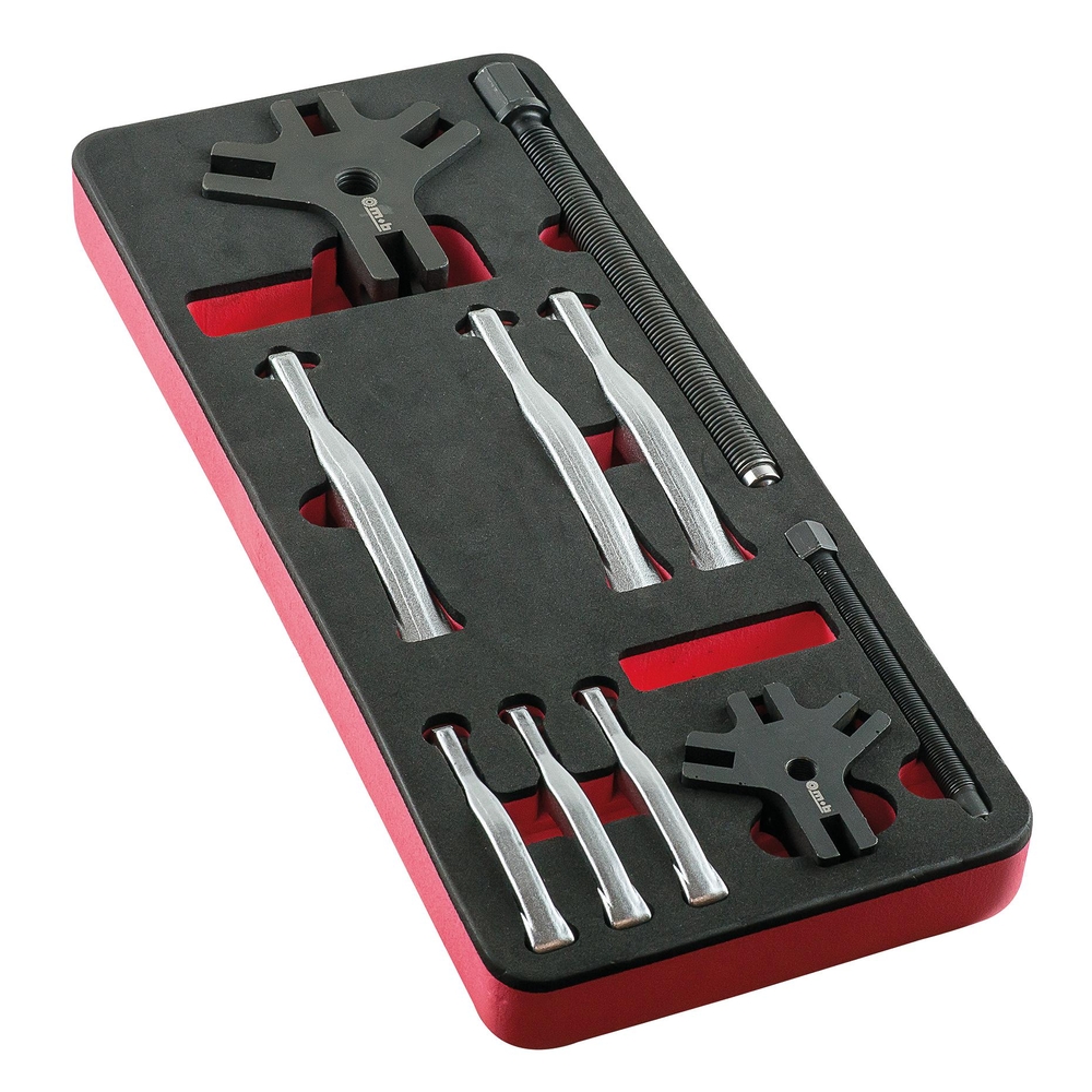1 extracteur 2 tonnes // 1 extracteur 5 tonnes. Dans module mousse bicolore 385 x 165 mm. Mousse bi-colore haute densité, ne casse pas, ne retient pas l'humidité et résiste aux produits de l'atelier. Chaque outil a une place propre. Inventaire des outils manquants en quelques secondes.