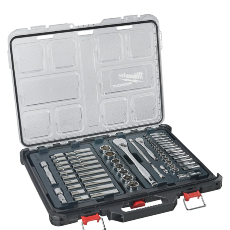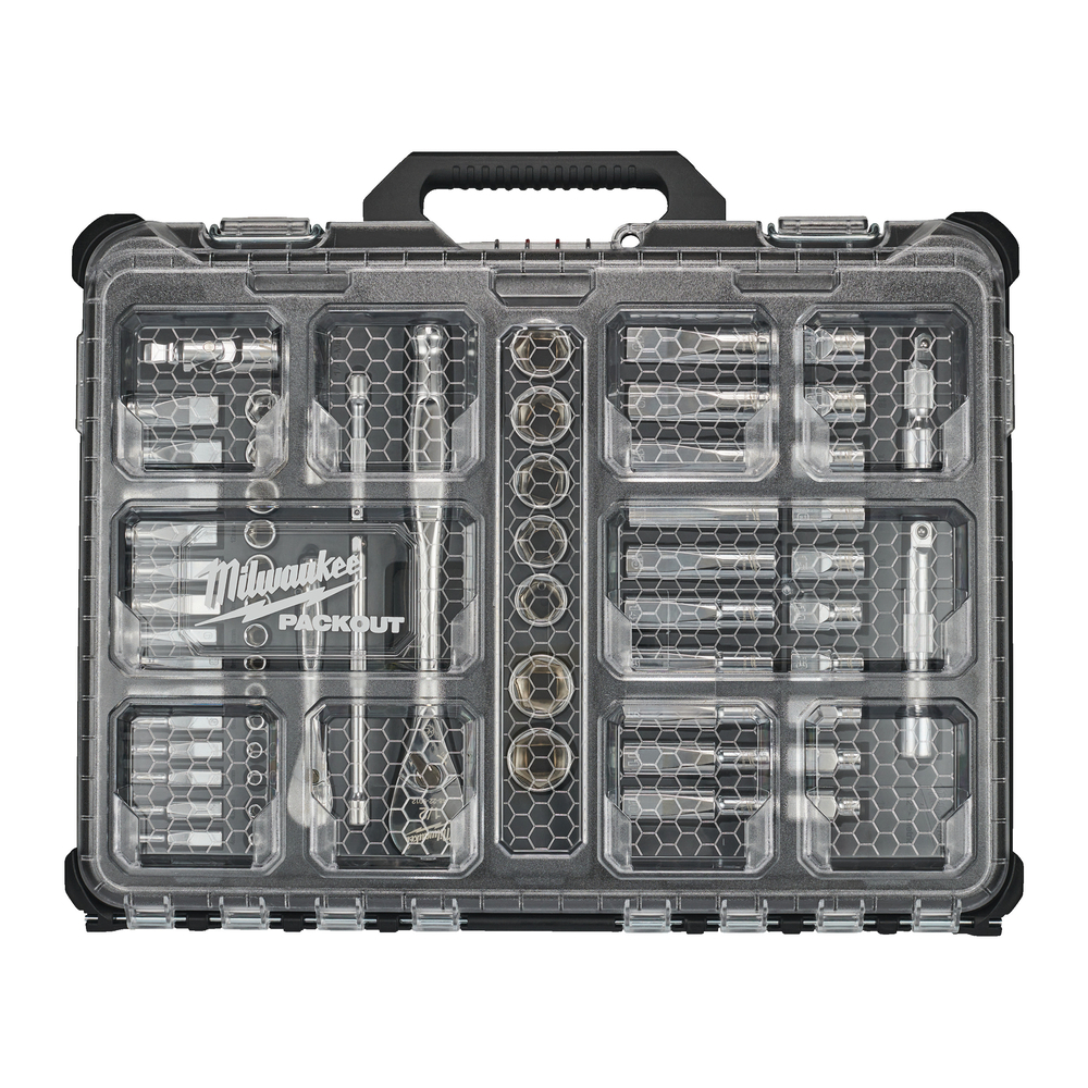 Contenu : Organiseur slim PACKOUT, douilles 1/2 : 10 mm, 11 mm, 12 mm, 13 mm, 14 mm, 15 mm, 16 mm, 17 mm, 18 mm, 19 mm, 20 mm, 21 mm, 22 mm, 23 mm, 24mm, 25, 26 mm/ Douilles longues : 10 mm, 11 mm, 12 mm, 13 mm, 14 mm, 15 mm, 16 mm, 17 mm, 18 mm, 19 mm/ Extension de douille 1/2 - 76 mm, Extesion 127 mm, Joint universel 1/2, douilles 1/4 : 4mm, 4.5 mm, 5 mm, 5.5 mm, 6 mm, 7 mm, 8 mm, 9 mm, 10 mm, 11 mm, 12 mm, 13 mm, 14 mm, 15 mm/ Douilles longues : 4 mm, 4.5 mm, 5 mm, 5.5 mm, 6 mm, 7 mm, 8 mm, 9 mm, 10 mm, 11 mm, 12 mm, 13 mm, 14 mm, 15 mm / Rallonge douille 1/4" - 76 mm, rallonge 152 mm, Joint Universel 1/4"