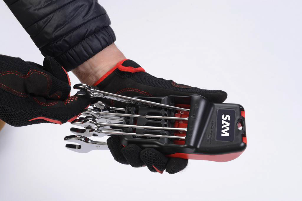 Ce râtelier comprend 8 clés mixtes dans les dimensions les plus courantes (8, 10, 11, 13, 16, 17, 18, 19 mm), permettant une grande polyvalence d'utilisation. Grâce à sa finesse structurale, il facilite l'accès aux écrous difficiles, rendant chaque intervention plus rapide et efficace. Le design ergonomique du râtelier augmente l'angle de travail côté fourche, permettant une utilisation encore plus performante. Chaque clé est marquée double face pour une lisibilité optimale, essentielle dans un environnement de travail où chaque seconde compte.