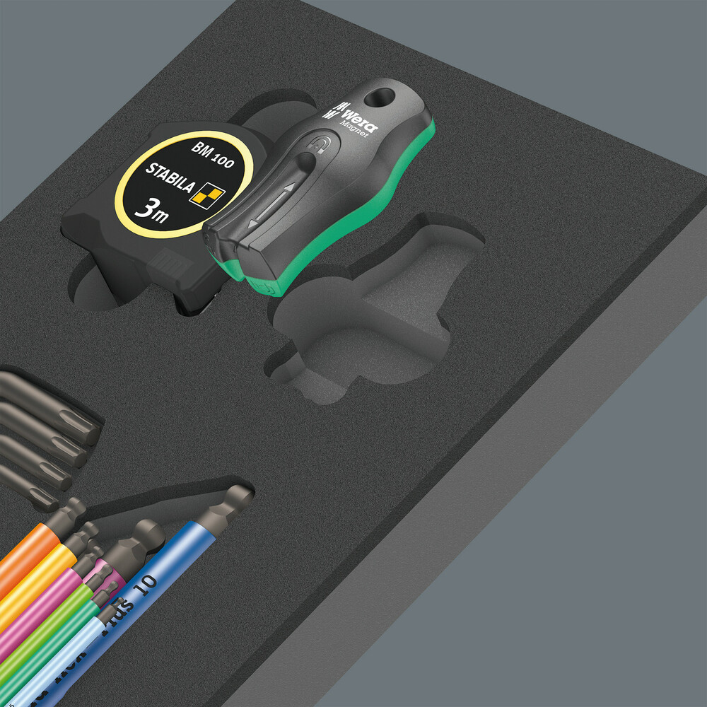 Insert en mousse durable ; bicolore pour repérer rapidement les pièces manquantes ; compatible avec la servante d'atelier Tool Rebel ; équipé du jeu de clés coudées 9 pièces Wera 950/9 Hex-Plus Multicolour 1 pour vis à six pans creux, jeu de clés coudées 9 pièces Wera 967/9 TX XL Multicolour 1 pour vis TORX®, 1 aimant 9500, 1 mètre-ruban de poche Stabila (3 m).