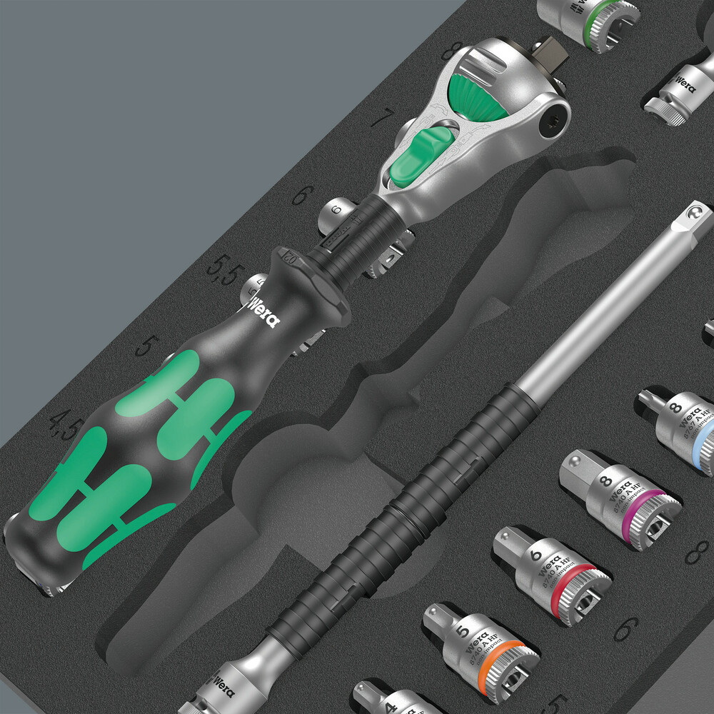 Insert en mousse durable ; bicolore pour repérer rapidement les pièces manquantes ; compatible avec la servante d'atelier Tool Rebel ; équipé de 1 cliquet Wera Zyklop Speed 1/4" et 36 accessoires.