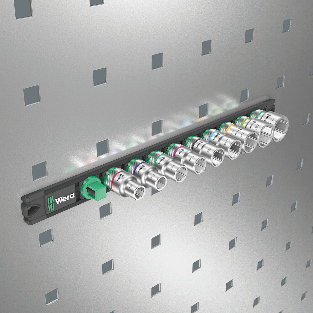 Barre magnétique avec 9 douilles pour l'utilisation manuelle et mécanique (sans chocs), 1/2". Un mécanisme de rotation souple assure un maintien sûr et un retrait facile des douilles. Système "Take it easy" une couleur en fonction de la taille pour trouver rapidement et facilement l'outil nécessaire. La barre magnétique permet une fixation temporaire sur les surfaces métalliques et la fonction Twist to unlock le maintien et le retrait en toute sécurité des douilles.