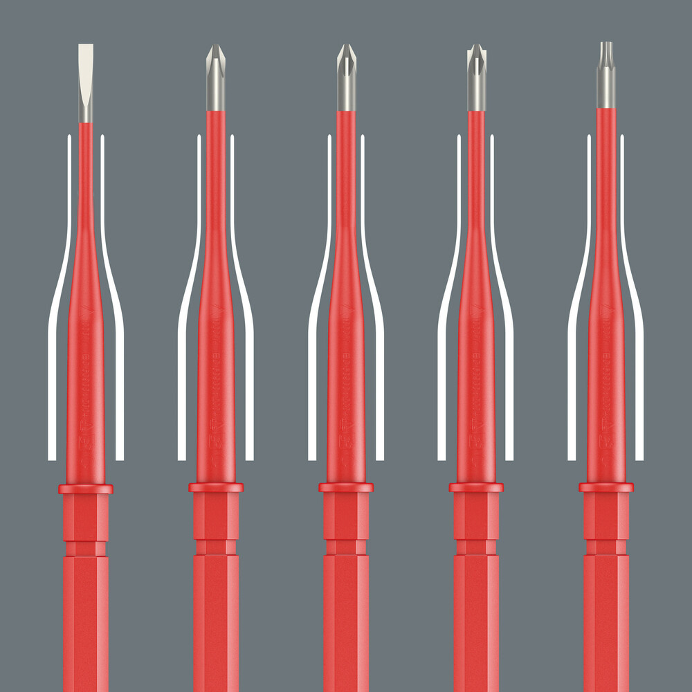 La lame à diamètre réduit, avec isolation protectrice intégrée, permettant d'atteindre et d'actionner les vis et éléments à ressort profondément situés, contrôlée pièce à pièce conformément à la norme IEC 60900.