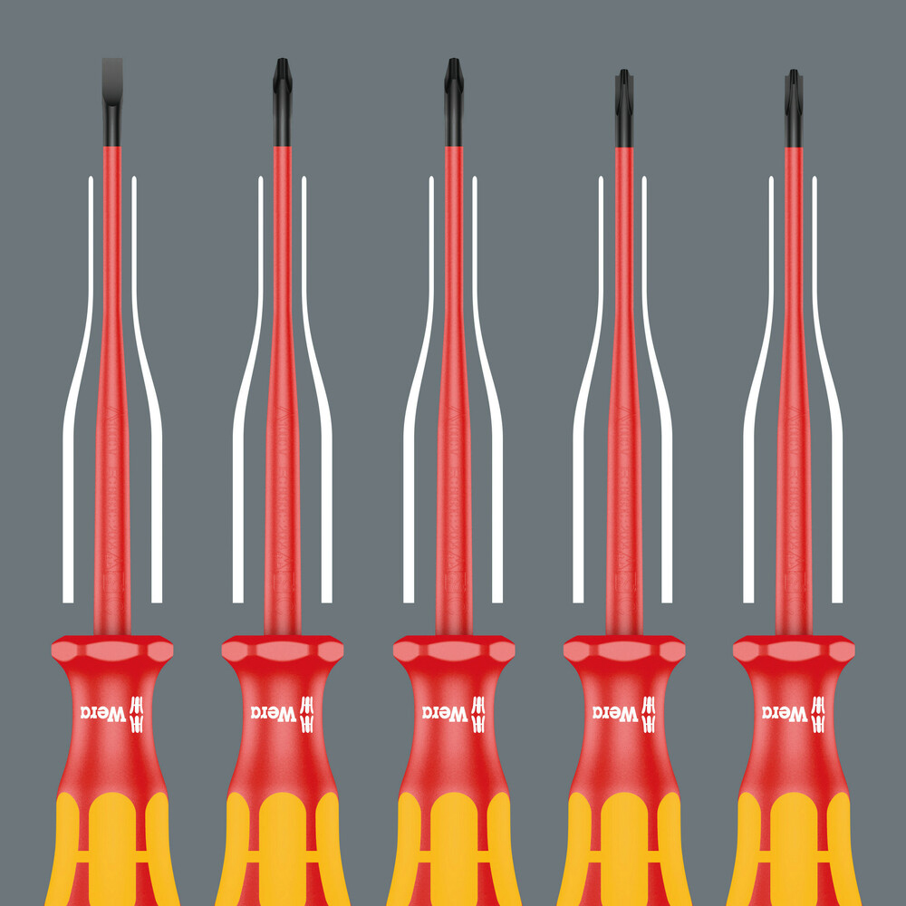 Le jeu comprend 14 tournevis Wera Kraftform VDE et 2 agrippe-vis. Les tournevis sont isolés et certifiés conformes à la norme IEC 60900, garantissant un travail en toute sécurité jusqu’à 1 000 volts. Cinq tournevis possèdent une lame à diamètre réduit pour accéder aux vis profondément encastrées. Le contrôle unitaire de chaque outil sous 10 000 volts assure une fiabilité maximale.