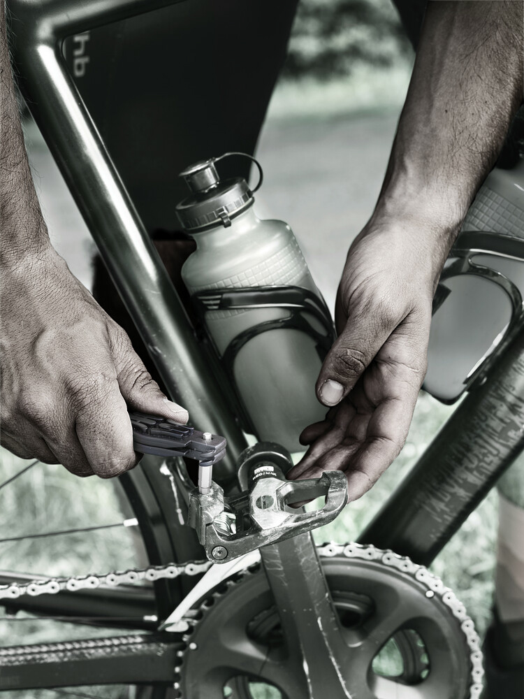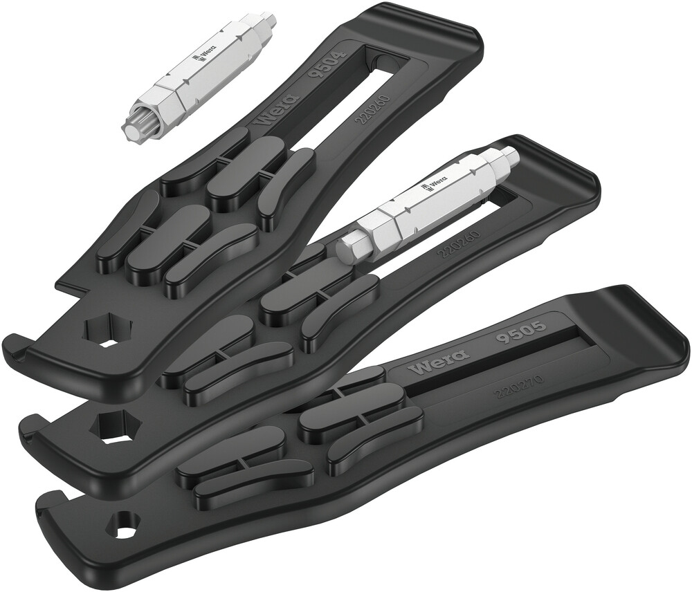 Un seul embout suffit pour quatre profils de vis différents. Réduction significative du poids de plus de 50 %. Grâce à ce gain de place considérable, le Bicycle Set 15 est idéal pour les interventions mobiles. Le fonctionnement des gros profils est possible grâce au montage sur ressort des petites pointes. L'embout dispose d'un emmanchement hexagonal 1/4" (série Wera 1), il est donc aussi utilisable avec par ex. les cliquets à embouts et manches avec Rapidaptor. Le démonte-pneu 9504 dispose d'une admission 1/4" pour utiliser un embout 1/4". Lorsque les deux démonte-pneus 9504 sont empilés l'un sur l'autre, il est possible d'utiliser un embout 4-en-1 pour obtenir un outil de vissage. Le démonte-pneu 9505 sert à la fois de démonte-obus et de dégonfleur. Les démonte-pneus et embouts 4-en-1 peuvent être emboîtés ensemble pour gagner de la place et éviter de perdre un élément.
