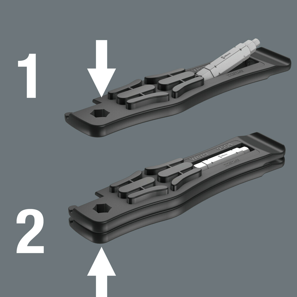 Chacun des embouts 4-en-1 9506 et 9507 est compatible avec quatre tailles de vis. Avec l'embout 4-en-1 9506 quatre tailles de vis à six pans creux (3,0 ; 4,0 ; 5,0 ; 6,0), avec l'embout 4-en-1 9507 trois tailles de vis à six pans creux (2,5 ; 5,0 ; 6,0) et une taille de vis TORX® (TX 25). Pour utiliser le profil supérieur, il faut appuyer en continu contre le ressort en vissant, de manière à enfoncer le profil plus petit.