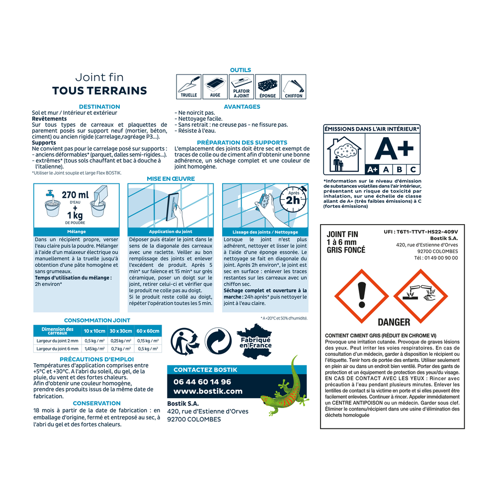 Découvrez Joint Fin Tous terrains Joint carrelage - Gris foncé 1kg - Lot de 6 - BOSTIK - 30121990 disponible à l'achat