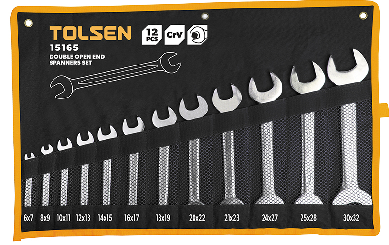 Kit de 12 clés mixte ouverte au chrome vanadium. Pochette avec clés taille : 6x7/8x9/10x11/12x13/14x15/16x17/18x19/20x22/21x23/24x27/25x28/30x32mm
