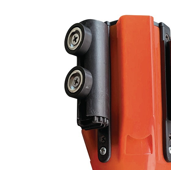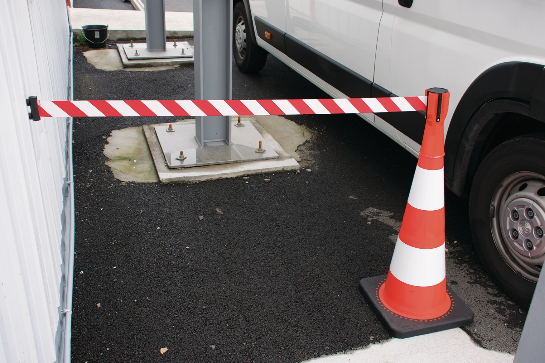 Dérouleur muni d'une sangle rouge et blanche de 50 mm et d'une longueur de 3 m (maxi). Se fixe sur un cône lesté (mini 4kg). Ce dérouleur s'auto enroule pour se refermer , il peut également être raccordé à un autre dérouleur de sangle pour permettre le balisage d'une zone. S'adapte à la longueur nécessaire et s'installe très rapidement. Ce dérouleur peut être complété par un kit d'aimants à visser. Le balisage se fait alors très simplement à partir d'une surface métallique.