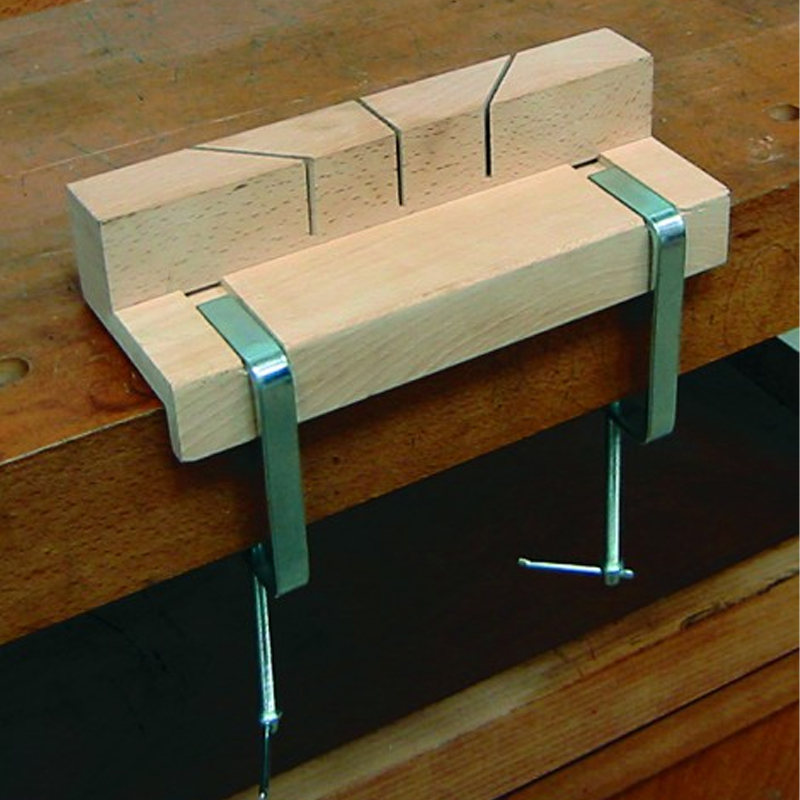 Le kit comprend une boîte à onglet de modèle 547 accompagnée de deux brides modèle 21-B. La boîte à onglet, fabriquée en contre-plaqué, présente une forme en Z avec une corniche de modèle 544. Ses dimensions sont les suivantes : 57 mm de largeur, 250 mm de longueur et 35 mm de profondeur, offrant ainsi trois possibilités de coupe.