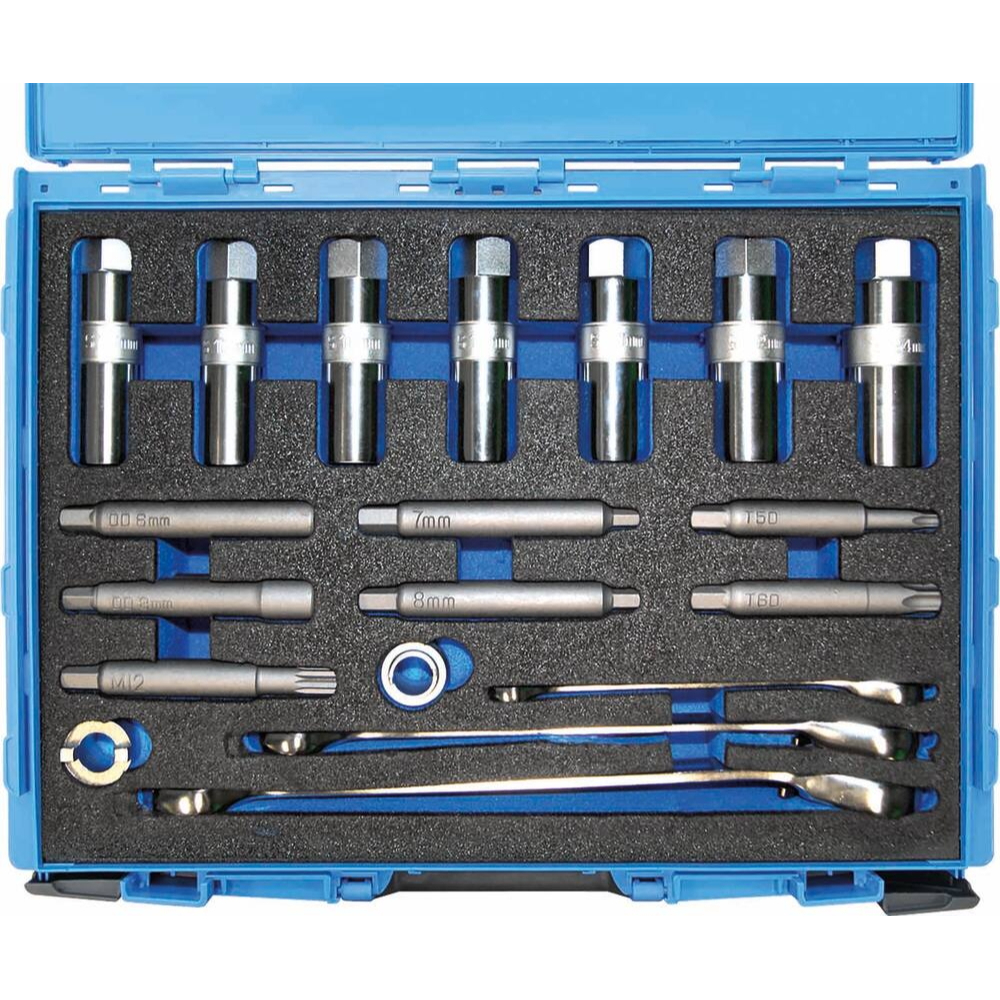 Ce jeu d'outils facilite le blocage de la tige interne des amortisseurs, permettant ainsi le démontage ou le serrage des écrous de la calotte. Il est particulièrement adapté aux amortisseurs MacPherson, avec un démontage possible après la compression et le blocage du ressort. Pour une utilisation optimale, il est recommandé d’utiliser une clé dynamométrique à cliquet en combinaison avec le jeu de clés, afin de visser l'écrou avec le couple de serrage prédéfini pendant le montage.