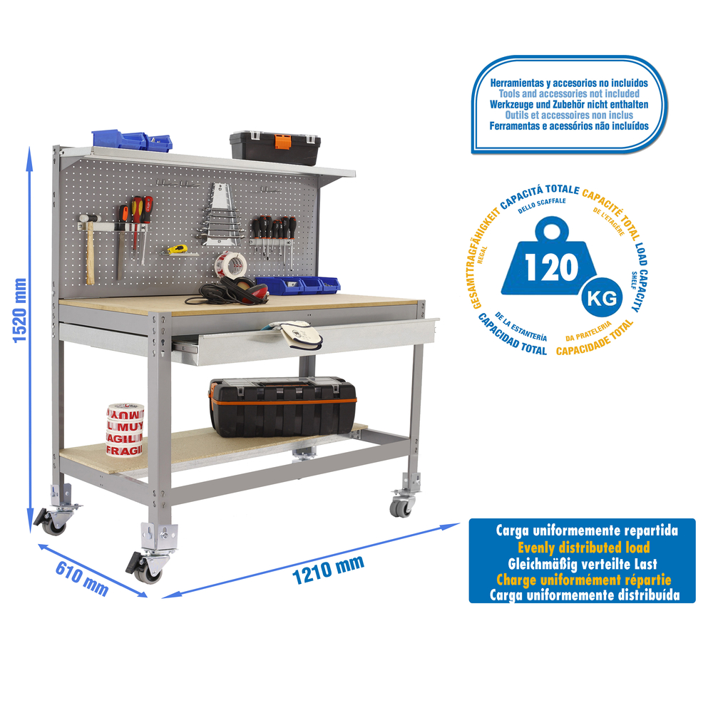 Kit établi mobile Bricolage - 1520x1210x610 - 3 niveaux Gris/Bois - SIMON RACK - 8435104985120