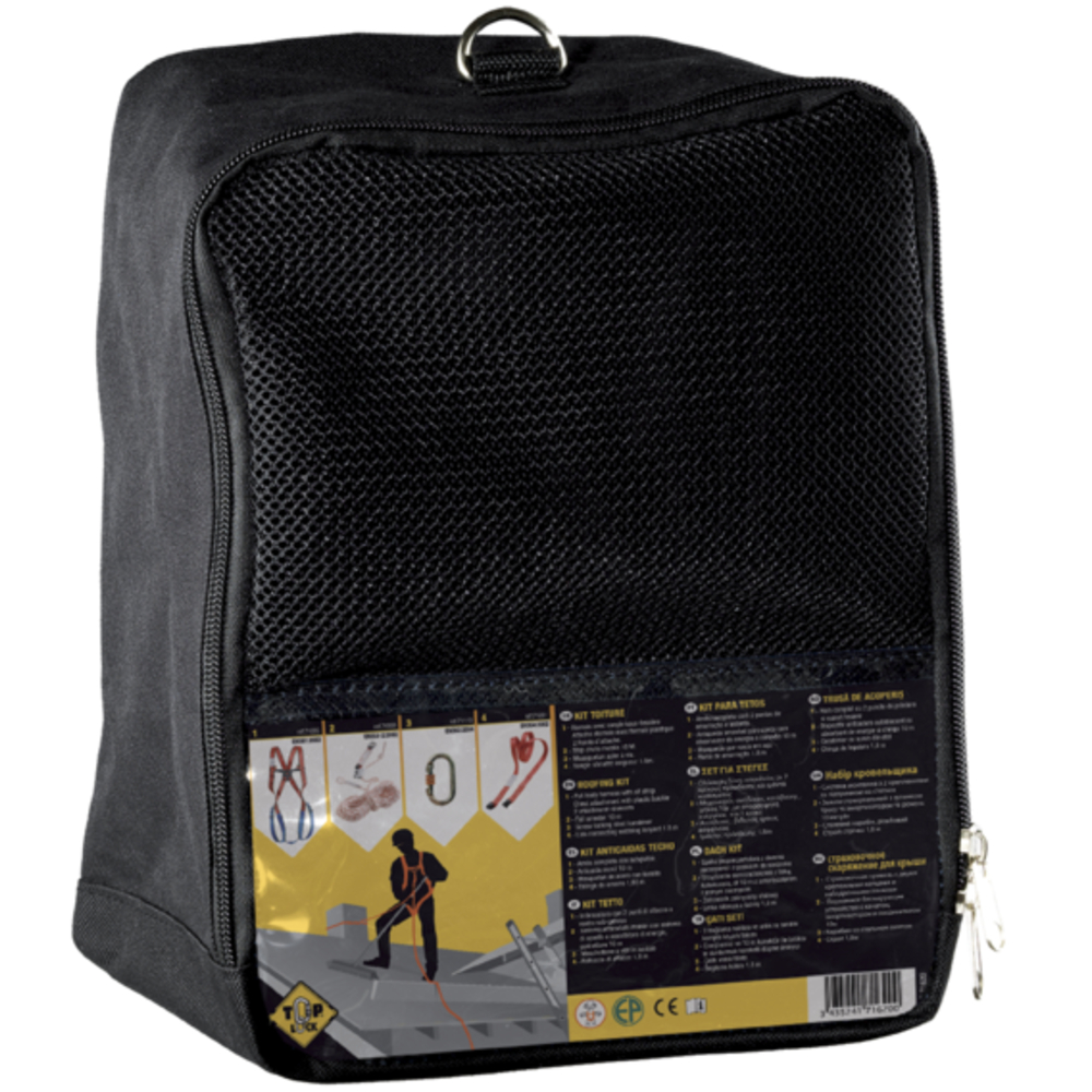 Le kit est composé d'un harnais confortable, d'une sangle d'ancrage robuste et de deux mousquetons de sécurité. L'ensemble est présenté dans un sac en toile pratique qui facilite le transport et la conservation. Destiné aux secteurs de la construction, de l'entretien et aux autorités publiques, ce kit antichute est classé dans la catégorie des Équipements de Protection Individuelle (EPI) de niveau III. Il est idéal pour les travaux de finition sur toiture et répond aux exigences de sécurité les plus strictes.