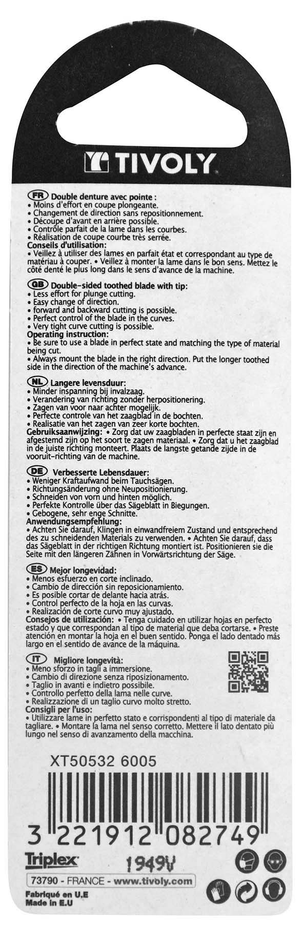 Découvrez Lame de scie sauteuse -Double denture -Pour bois dur massif -Attache U / L: 100 / H: 75 / Mixte TIVOLY - XT505326005 disponible à l'achat