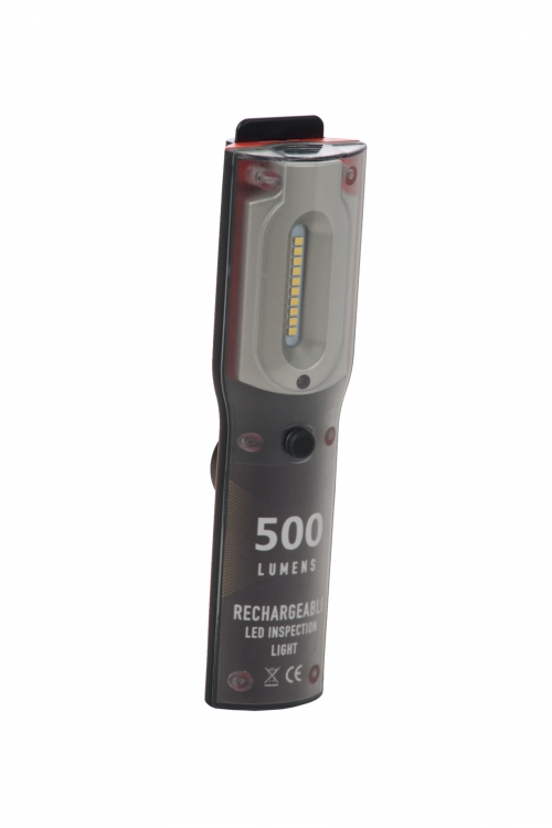 Lampe torche LED - 500 lumen en front - 100 lumen en torche - sur batterie Li-on - interrupteur 2 positions - pied stabilisateur pliable aimanté - attache pour ceinture - livré avec chargeur de secteur et allume cigare.