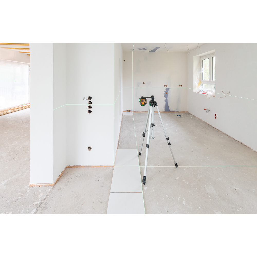- Il génère 3 lignes laser vertes à 360° (horizontales et verticales) qui permettent de créer des équerrages au sol facilitant l'alignement et la pose de carreaux.