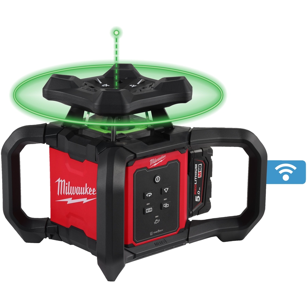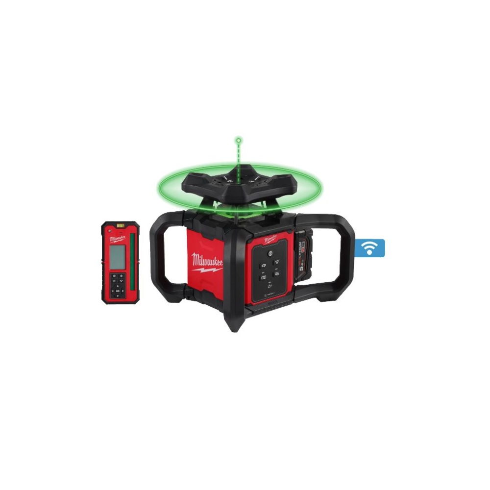 Laser Rotatif Vert Milwaukee Horizontal/Vertical, 300 m - M18 RLOHVG300-501C, conçu pour les professionnels. Idéal pour les travaux d'intérieur et d'extérieur, ce laser rotatif offre une détection automatique du centre de la cellule de réception, garantissant des alignements précis à longue distance. Sa diode laser verte de haute intensité assure une visibilité exceptionnelle, jusqu'à 4 fois supérieure à celle des lasers rouges, tandis que le masquage réglable prévient les interférences. Avec un indice de protection IP66, il résiste à l'eau, à la poussière et aux chutes jusqu'à 1,5 m. L'auto-nivellement est assuré sur une plage de ±5° et offre une portée impressionnante de 300 m avec la cellule RD300G. Son affichage rétroéclairé améliore la lisibilité, et la télécommande intégrée facilite les réglages. Avec une autonomie maximale de 32 heures et une précision de ±1,6 mm à 30 m, c'est l'outil parfait pour des performances optimales. Inclus : cellule de réception RD300G, batterie M18 B5, chargeur M12-18 C et coffret.