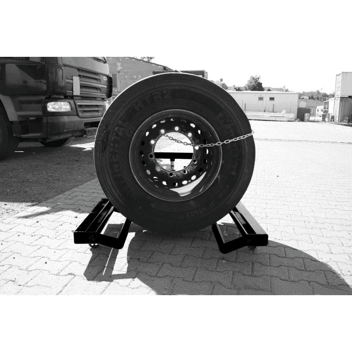 Ce chariot est équipé d'une chaîne d'accrochage pour sécuriser les roues pendant le transport. Il offre un réglage continu, permettant une adaptation facile à la taille des jantes et des pneus. Pour assurer une grande stabilité lors de son utilisation, il est conseillé de l'utiliser sur des surfaces planes.