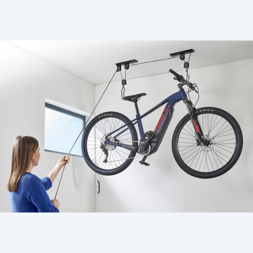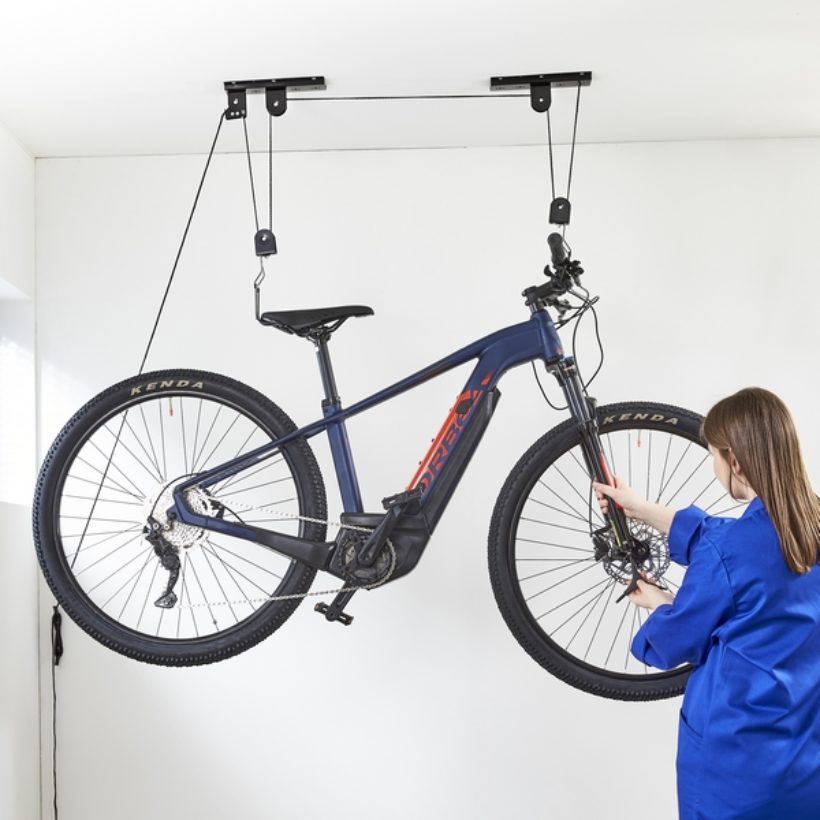 Le lève vélo est l’outil idéal pour ranger, nettoyer et réparer votre vélo à la bonne hauteur. Conçu pour un seul vélo, il se distingue par un système de levage optimisé pour un encombrement minimal au sol. Avec un blocage automatique, il offre une hauteur maximale de 4 mètres et peut soulever un vélo pesant jusqu'à 30 kg grâce à sa corde de 14 mètres. Les plaques à fixer au plafond mesurent 250 mm de longueur et 85 mm de largeur, garantissant ainsi une installation sécurisée et pratique.