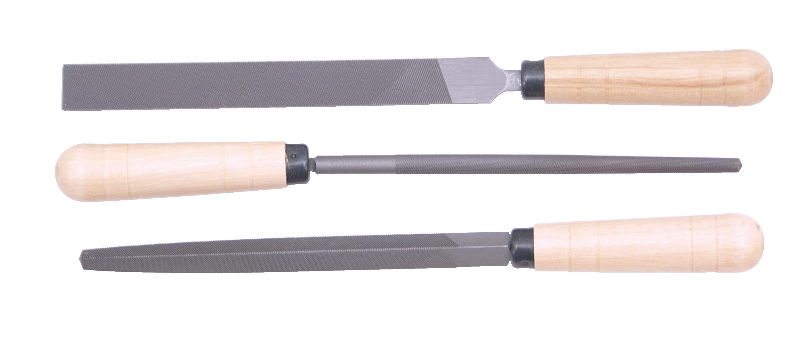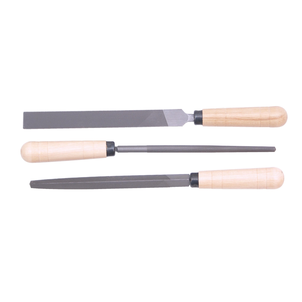 Le produit comprend trois types de limes : une lime plate, une lime triangulaire et une lime ronde, toutes conçues avec des propriétés mi-douces, permettant de travailler efficacement sur divers matériaux. Grâce à leur conception ergonomique, ces limes sont idéales pour obtenir des finitions soignées et détaillées sur vos projets.
