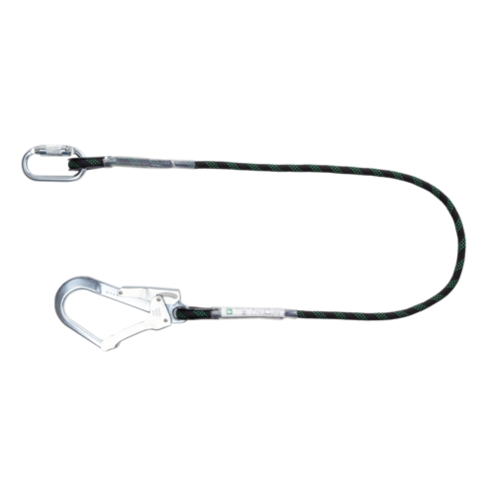 Cette longe est fabriquée en corde tressée de polyamide d’un diamètre de 11 mm, avec des coutures protégées par une gaine transparente pour une meilleure durabilité. Elle est équipée d’un mousqueton en acier à vis et d’un connecteur en acier à ouverture de 50 mm, assurant une connexion sécurisée. Sa résistance à la rupture dépasse 22 kN, et elle supporte une capacité utilisateur jusqu’à 100 kg.