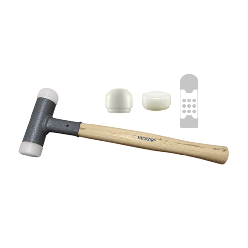 Les embouts en nylon blanc, d’une dureté de 73 Shore, sont non seulement résistants à l'huile et à la graisse, mais également conçus pour une durabilité exceptionnelle. Le manche en hickory verni, en plus d’être esthétique, amortit les vibrations pour une prise en main agréable. La robustesse du maillet est renforcée par un raccord en aluminium et une goupille de sécurité, garantissant sa longévité. La tête est entièrement soudée par robot, et le revêtement en peinture poudre époxy offre une protection anti-corrosion, tandis qu'une douille de protection empêche les erreurs de frappe.
