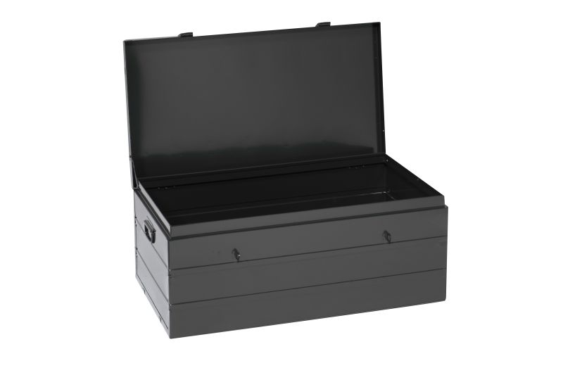 Capacité 115 litres,2 fermoirs + 1 tringle avec trou Ø 6 pour cadenas, 2 poignées,Renforts faces et côtés,1 compas de maintien du couvercle en position ouverte,Omégas de renforts soudés sur couvercle et fond,Empilable,Gris