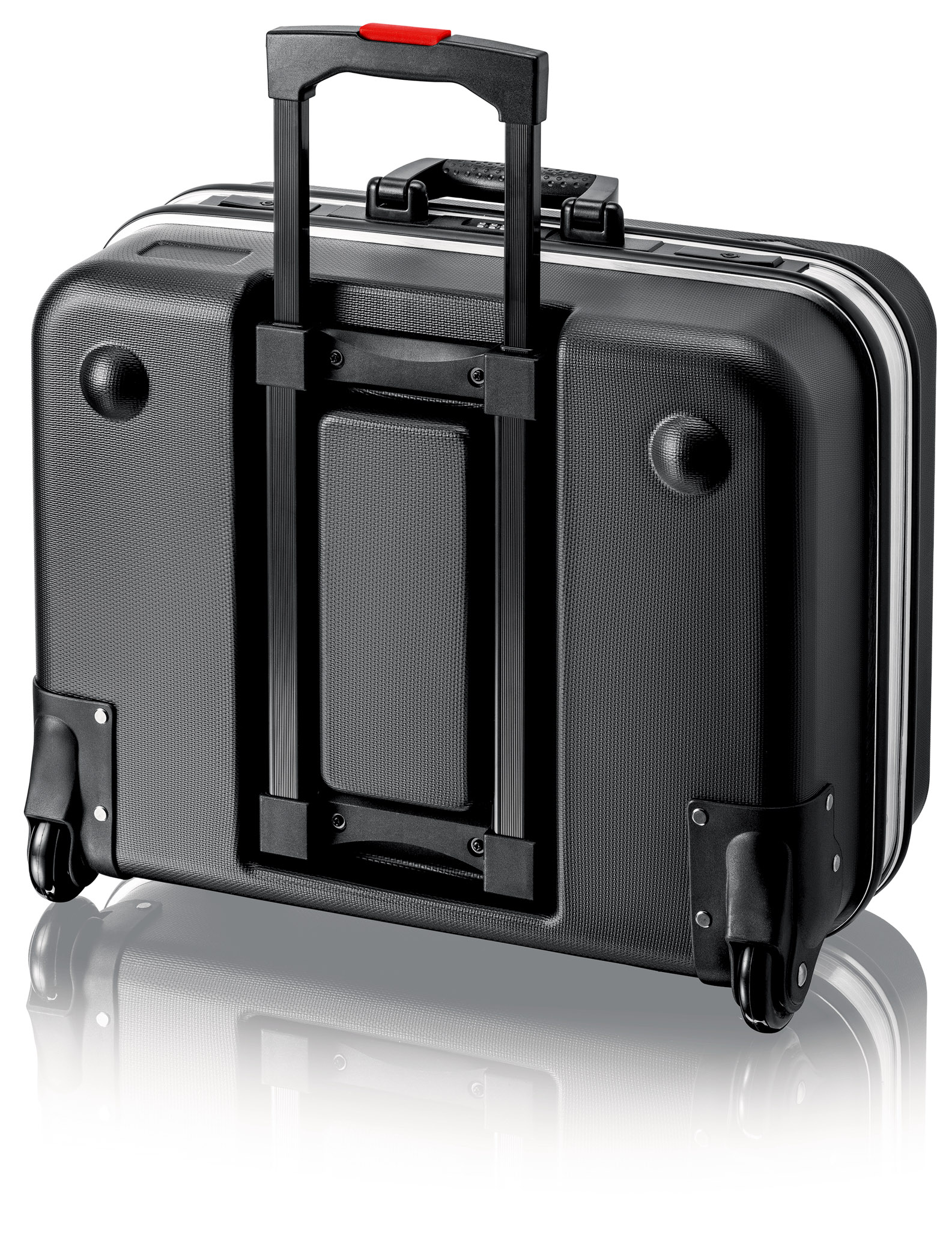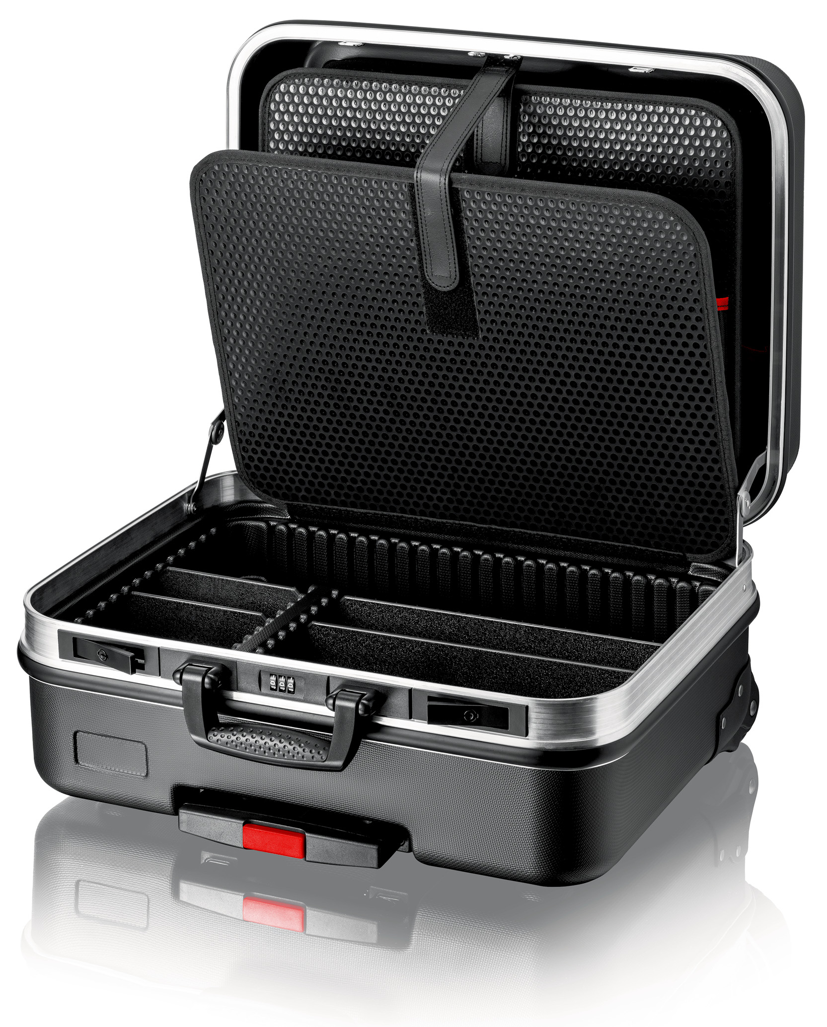 Poignée télescopique intégrée dans le fond ainsi que deux roues souples montées à l'extérieur. Deux serrures à bascule en métal et un cadenas à trois chiffres pour une fermeture sécurisée du couvercle. Champ d'identification avec deux étiquettes pour l'étiquetage individuel. Charge utile max. : 20 kg. Volume : 33 litres. Poignée ergonomique solide. Version en ABS résistant, noir. Châssis en aluminium enveloppant. Charnières métalliques. Porte-documents dans le couvercle. Deux panneaux à outils amovibles en feuille à paroi creuse anti-poussière en polypropylène, avec 31 pochettes à outils. Premier plateau à outils avec 10 pochettes et un passant élastique côté couvercle et 11 pochettes étroites plus une large côté fond. Second plateau à outils avec 10 pochettes et un passant élastique côté fond et un compartiment à documents côté couvercle. Coque de fond, à fixer par bouton-pression, 70 mm de haut, pouvant être compartimentée par des inserts, plateau couvercle avec 13 grandes pochettes et un compartiment plat. Avec un total de 54 compartiments d'insertion.