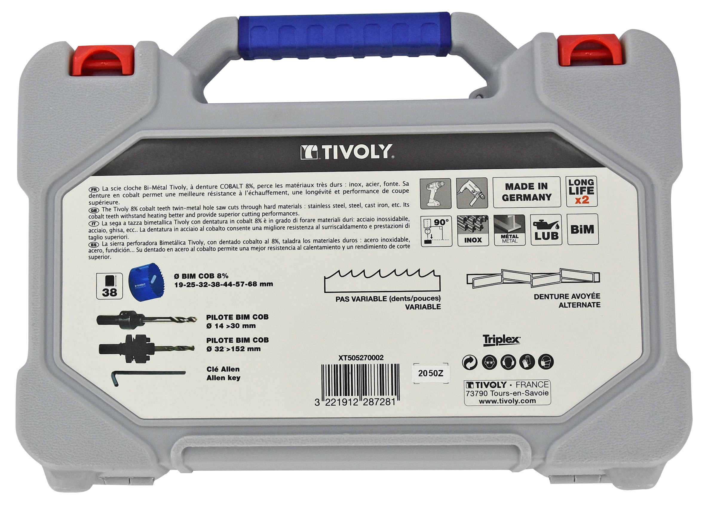 Mallette de 10 pièces - 7 scies cloches bi-métal cobalt 8% Ø 19 à 68mm + 2 pilotes + 1 clé Allen TIVOLY - XT505270002